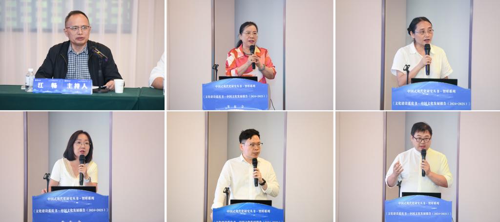 发布会现场,研创团队代表,分别围绕文化建设蓝皮书总报告、中国文化国际传播与影响力、中国文化产业发展、长江经济带文旅产业高质量发展效率测算与策略研究、中国文化发展满意度调查:社会公众的认同与评价分析等,介绍了相关研究过程与成果。